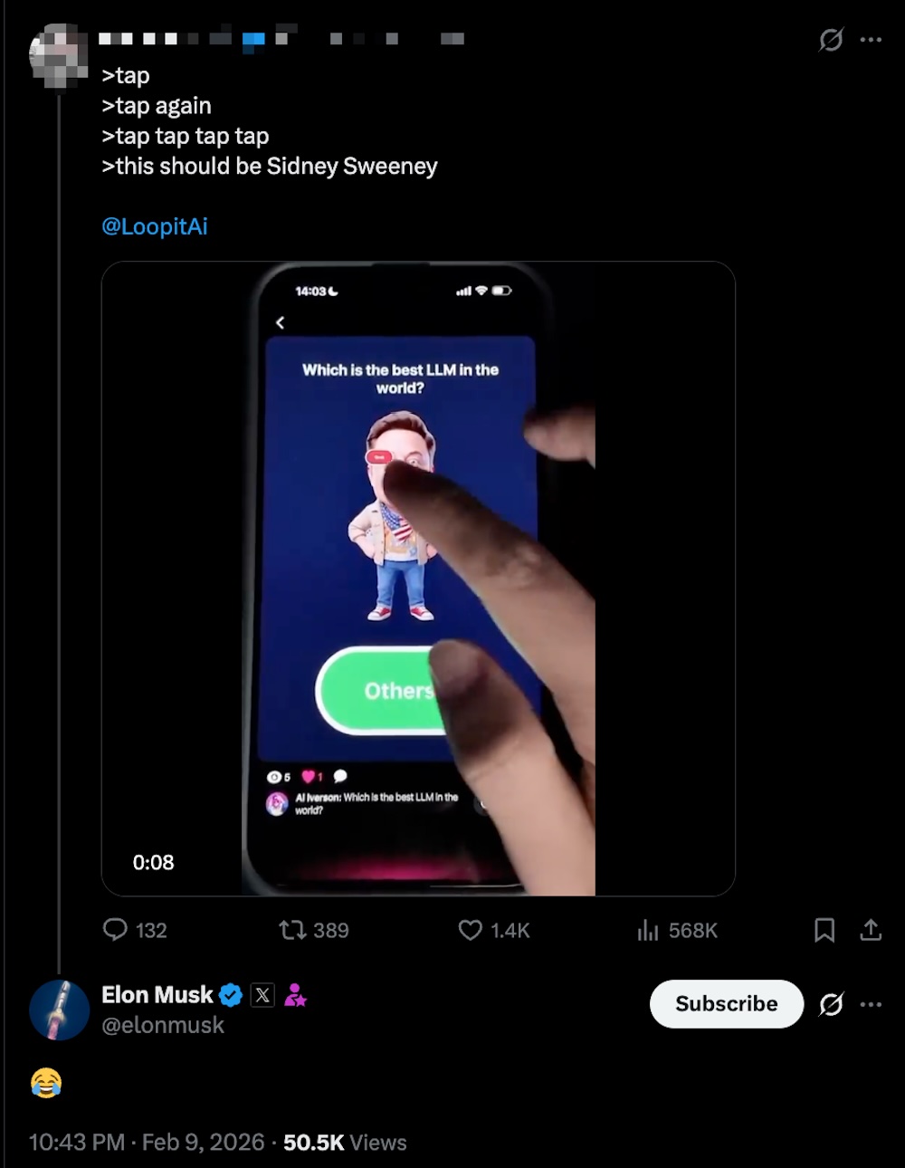 下方两个选项别离是“Grok”(马斯克旗下大模子)和“Others”。但搞笑之处在于,“Grok”按钮会不休减轻并回避点击,让东谈主只可无奈点击“Others”。这类“带梗可玩”的互动方式,恰是Loopit的中枢亮点之一。
